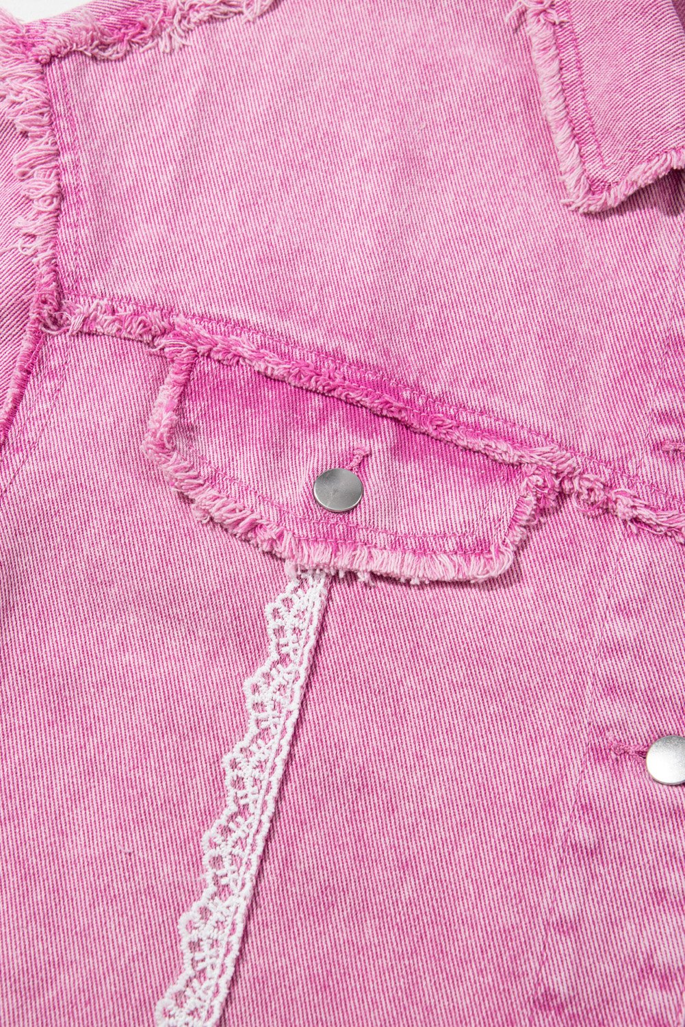 Pink Lace Patchwork Distressed Buttoned Denim Jacket