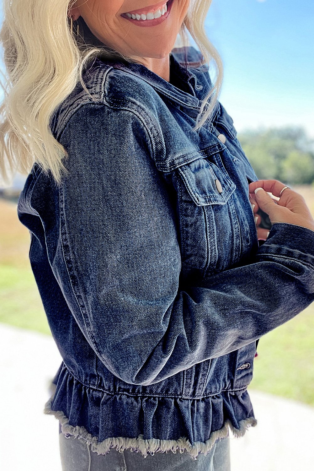 Navy Blue Ruffle Raw Hem Flap Pockets Denim Jacket