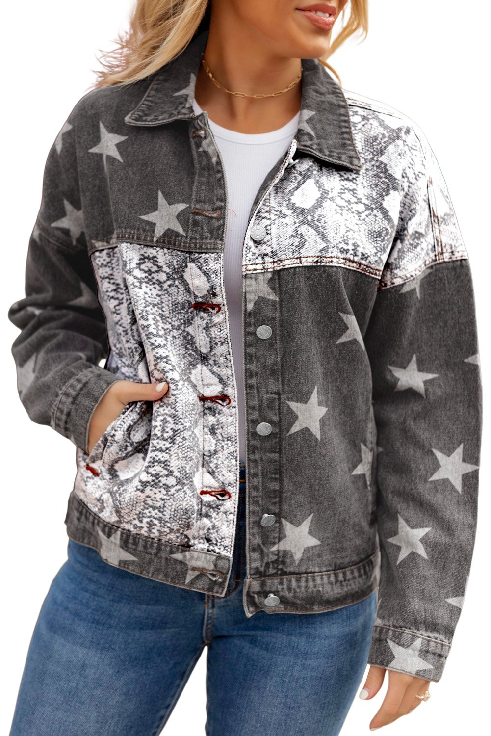 Home > Black Star Snakeskin Printed Patchwork Denim Jacket