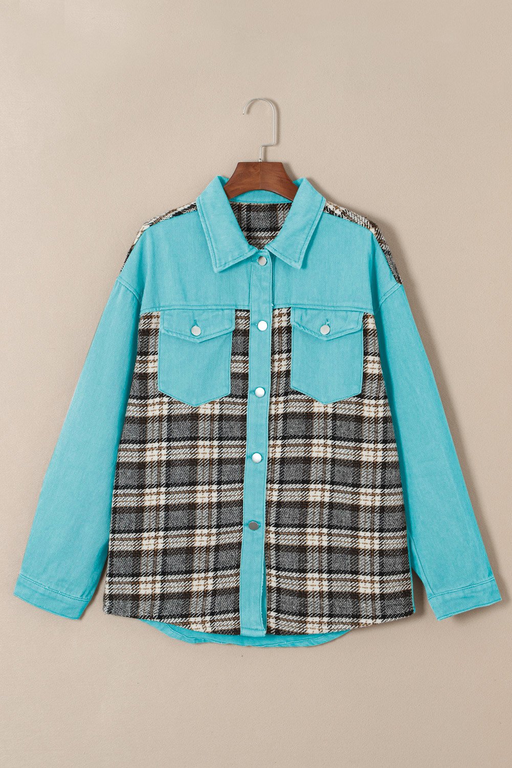 Sky Blue Plaid Patchwork Pockets Denim Jacket