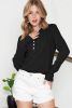 Black Solid Color Waffle Knit Long Sleeve Henley Shirt